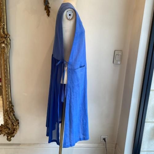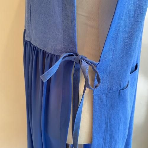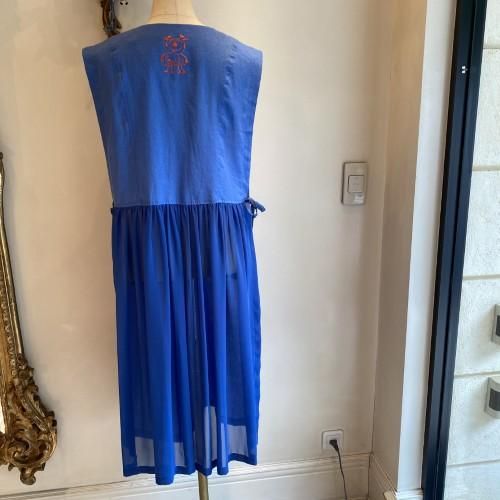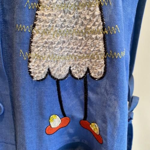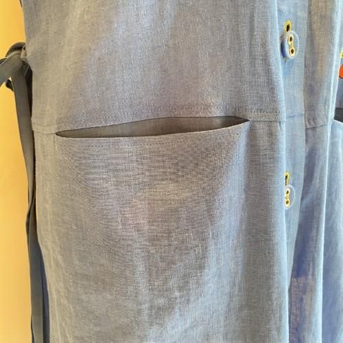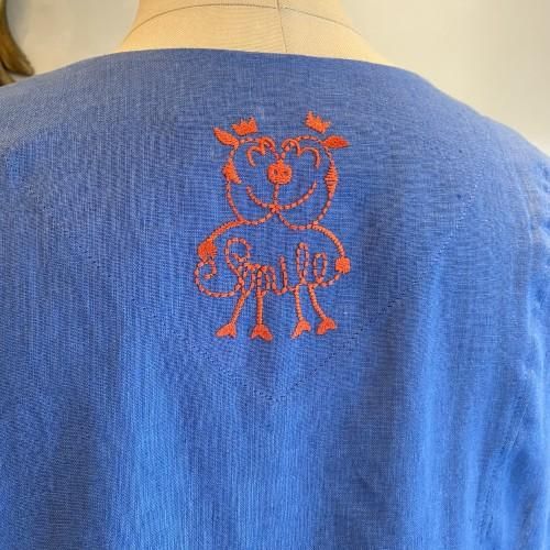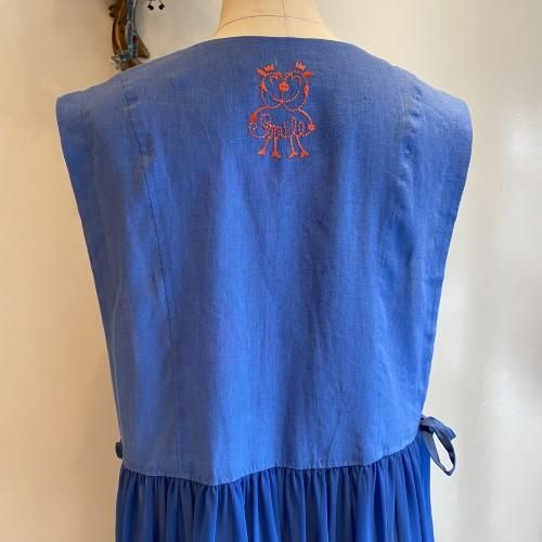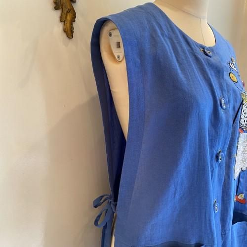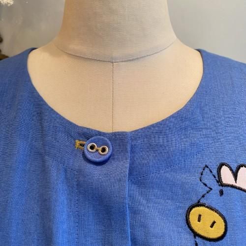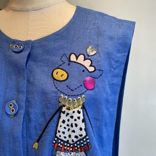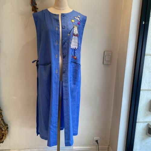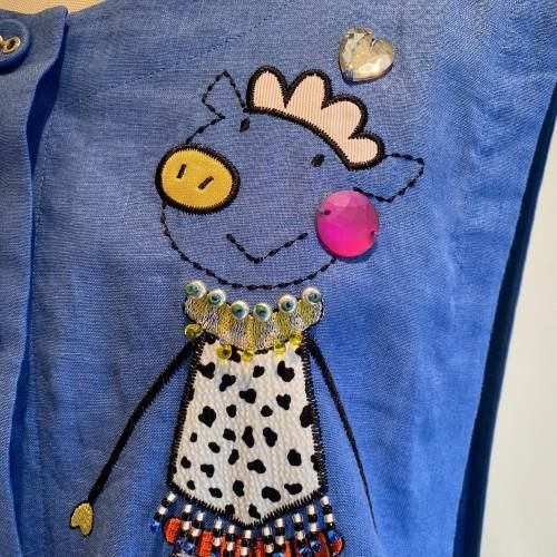 50%オフ 脇の開いたタブリエタイプのロングベストです。ぶたさんのミシン刺繍にビーズ刺繍。お尻部分はポリエステル素材なのでシワも気になりません。ワンピースに羽織ったり、パンツに合わせて颯爽とお出かけするのも楽しいですね。ポケットあり。手洗い可。中国製。