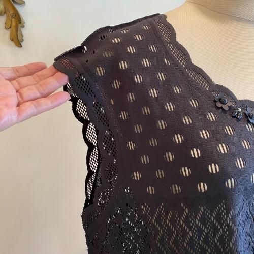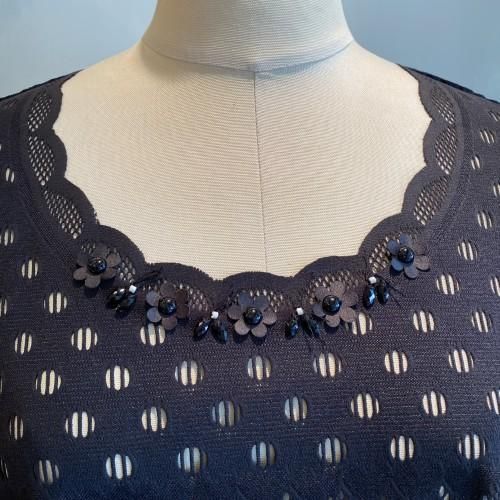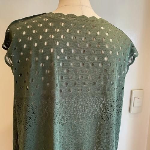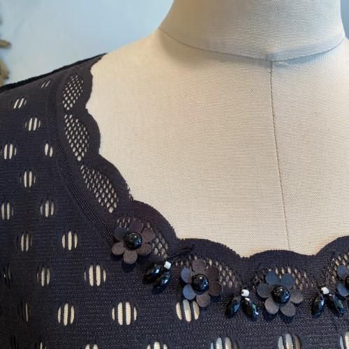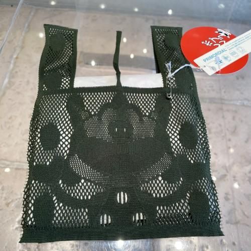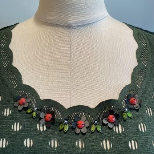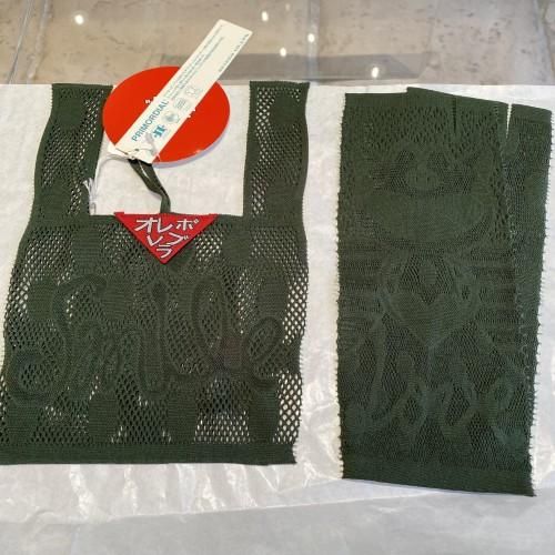 新製品です。チュニック丈のベストとショート丈のアームがミニバッグにちょこんと入ったセットです。伸縮性のある素材なので、とても軽くてお召しになりやすいアイテムです。ぶたさんの柄が分かりにくいと思いますので白い紙を間に挟んで撮影した画像をご参考になさってください。襟元にはお花とビーズの飾り付き。手洗い可。日本製。