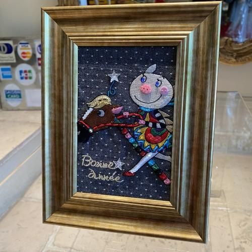 2026年の午年ニューイヤーフレームです♪ギャロップぶた子ちゃんと福福新しい年をお迎えくださいね。ラメドット生地にミシン刺繍+ビーズ刺繍。立てかけ、壁掛けどちらもできる軽量額縁です。フレームゴールド色アンティーク風塗装。日本製。